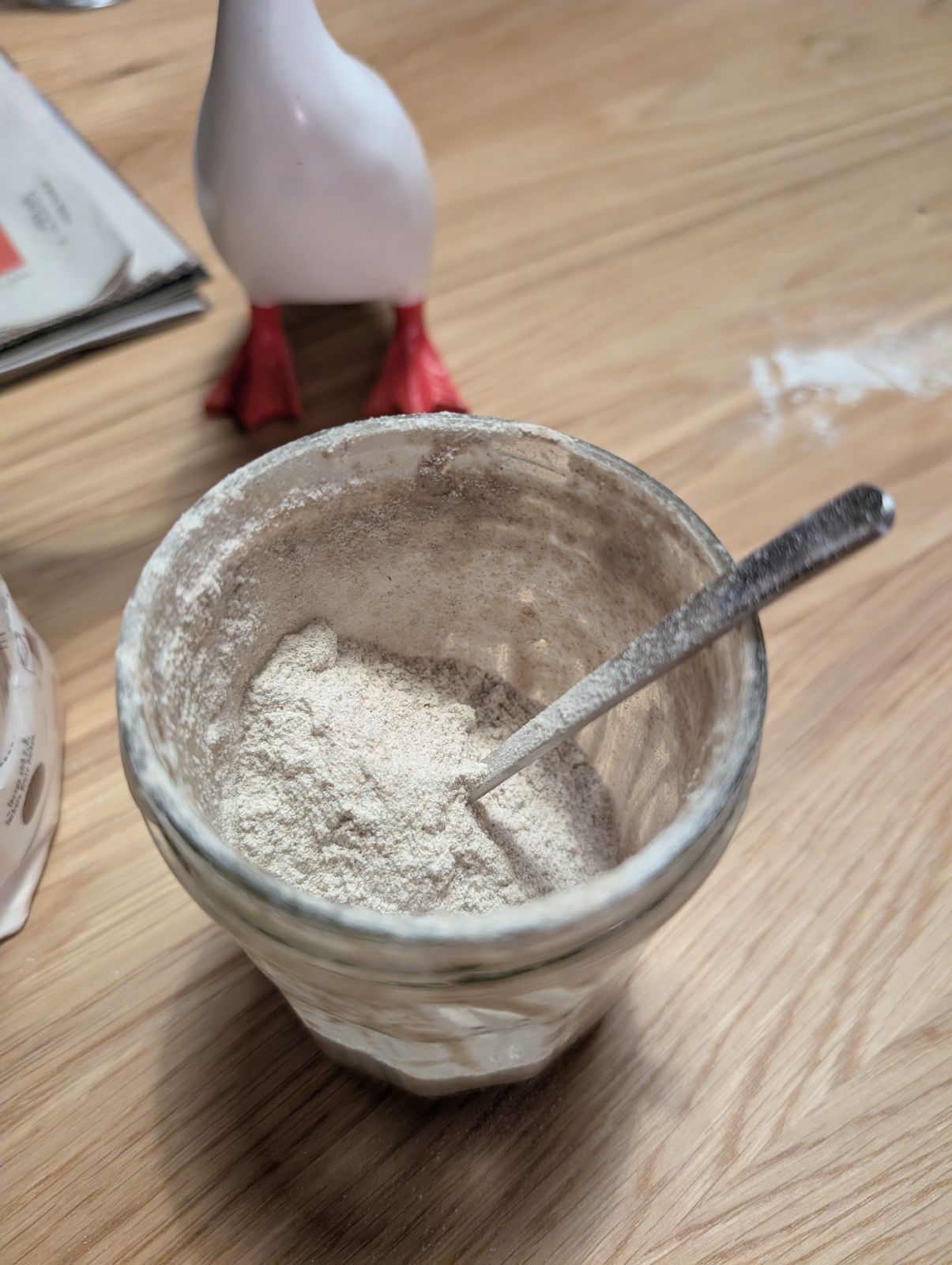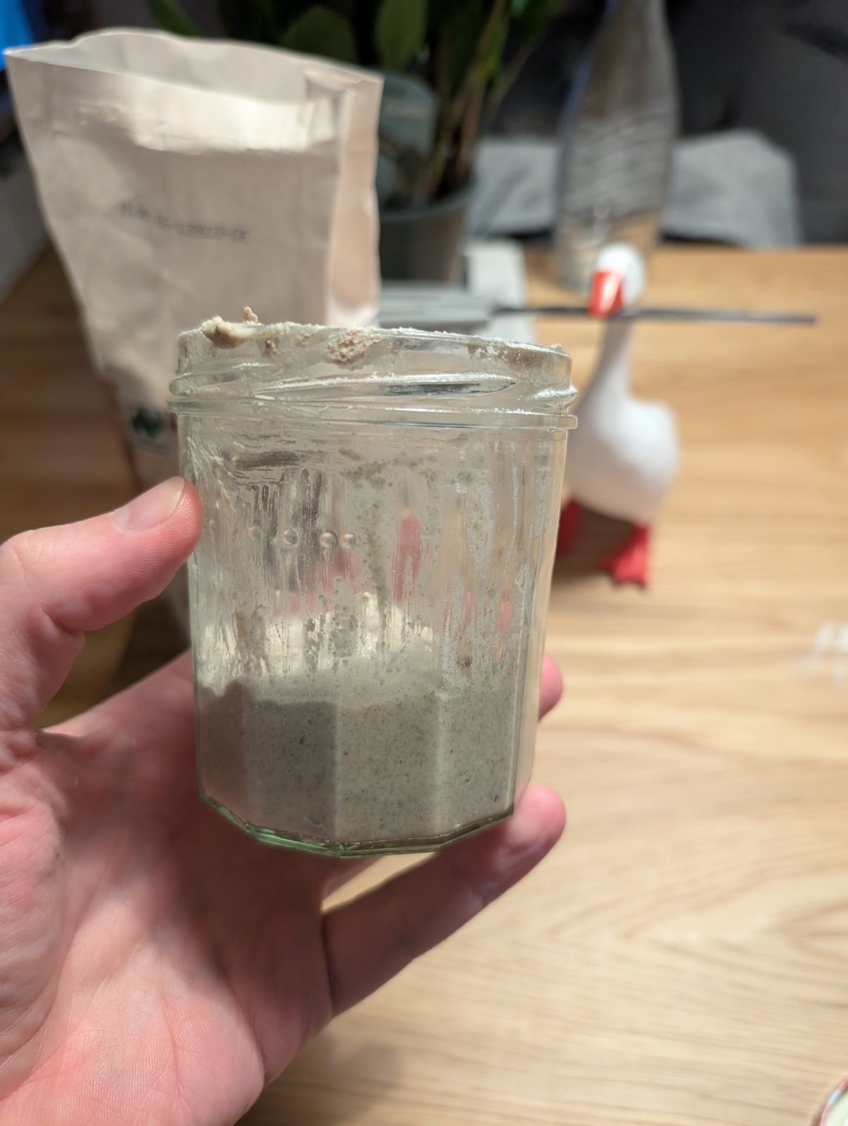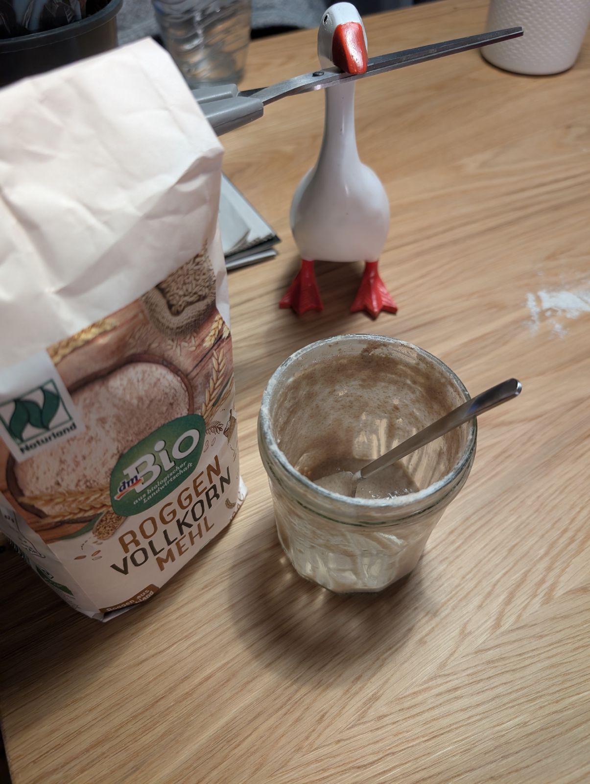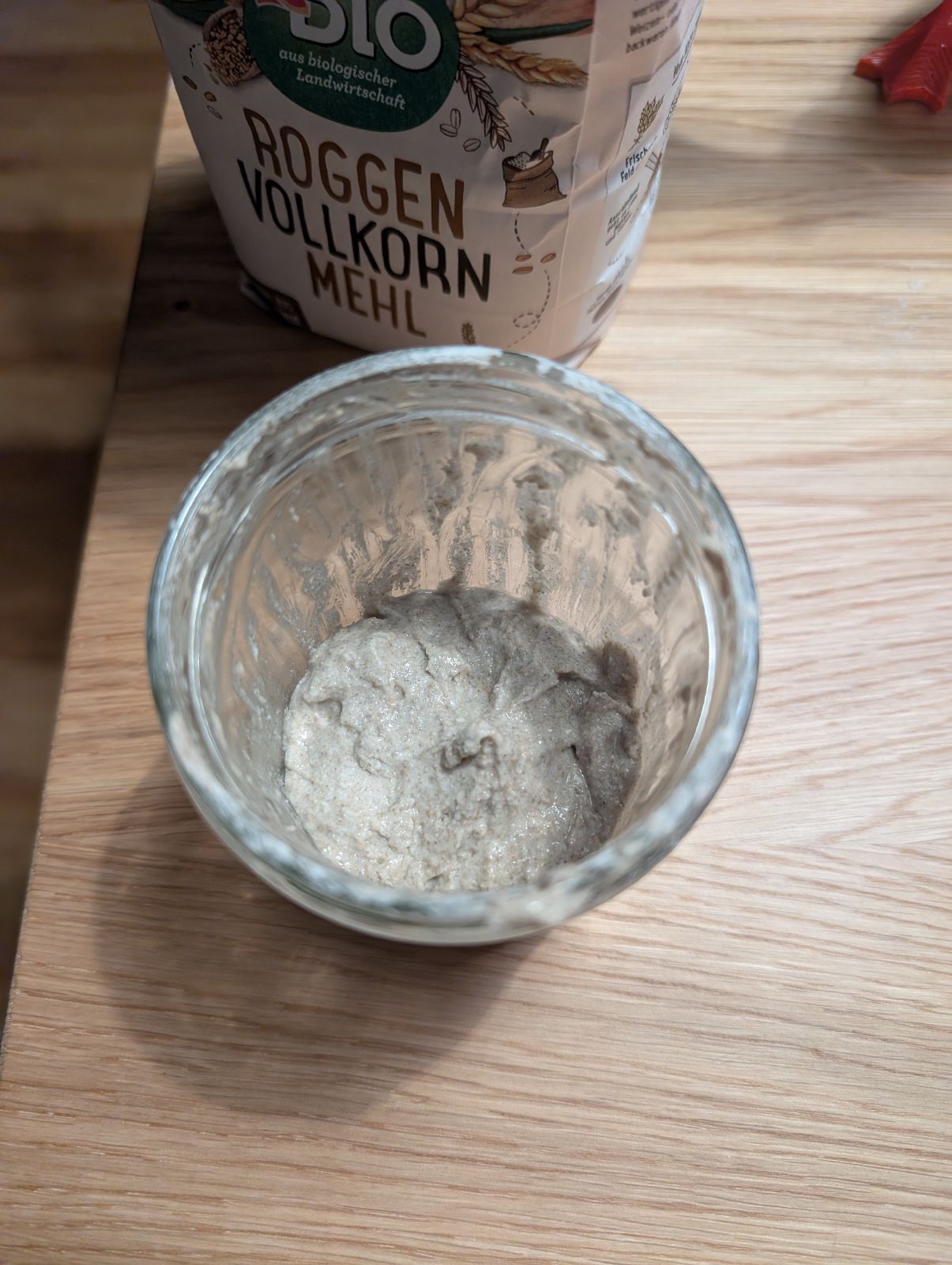 Ein starker Sauerteig kann problemlos eine Woche im Kühlschrank leben. Einmal in der Woche sollte Bernd jedoch gefüttert werden - am besten mit einem Vollkornmehl. Dafür nimmt man einen Großteil des bestehenden Starters aus dem Glas und gibt in gleicher Menge Mehl und Wasser dazu. Viele Leute messen die Mengen ab und häufig liest man von einem Verhältnis von 1:5:5. Auf ein Gramm Starter kommen 5g Wasser ung 5g Vollkornmehl. Das ist prinzipiell nicht nötig. Bernd gedeiht auch ohne Waage. Dafür etwa zwei Teelöffel Starter im Glas lassen und mit Mehl aufschütten. Dann mit Wasser mischen bis die Konsistenz des Teiges die eines festen Pfannkuchenteiges ist.